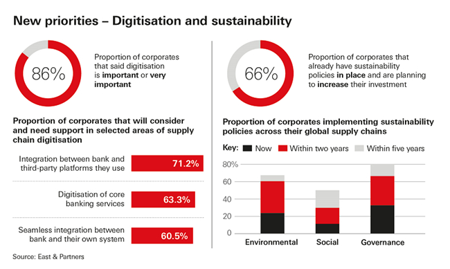 Another way we can see the broadening scope of banking is how it relates to priorities that are growing among treasurers. The survey found that both digitisation and sustainability are no longer optional considerations, but rather mission critical for the future of supply chain management.